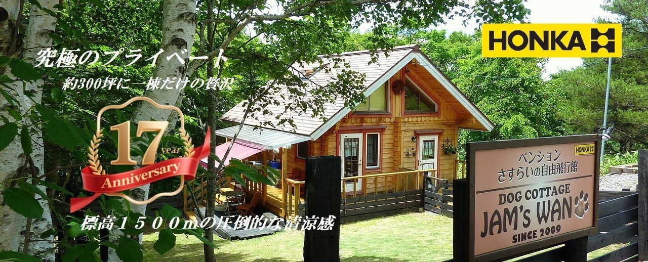 DOGコテージJAMSWAN!は2009年夏、ワンちゃん同伴のお客様専用のとってもおしゃれなログコテージとして誕生しました。JAMSWAN!の唯一無二はなんといっても”プライベート感” 約300坪の敷地にコテージは一棟だけ。静かな森に囲まれ、他のお客様やワンちゃんに気兼ねすることなくゆっくりとご滞在いただけます。ご家族での初めてのお出かけにもおススメです。そして自慢は最新の設備が充実した北欧フィンランドの世界最大ログハウスメーカー”ホンカ”のログハウスと広いプライベートドッグラン。宿泊施設として設計された建物ではなく本格的な住宅用ログハウスです。JAM’s WAN!は心からワンちゃんを愛する人のための、たった一棟のプレミアムログコテージ。コテージ内はワンちゃんFREE、我が家と同じ距離で家族みんなで楽しい休日をお過ごしください!