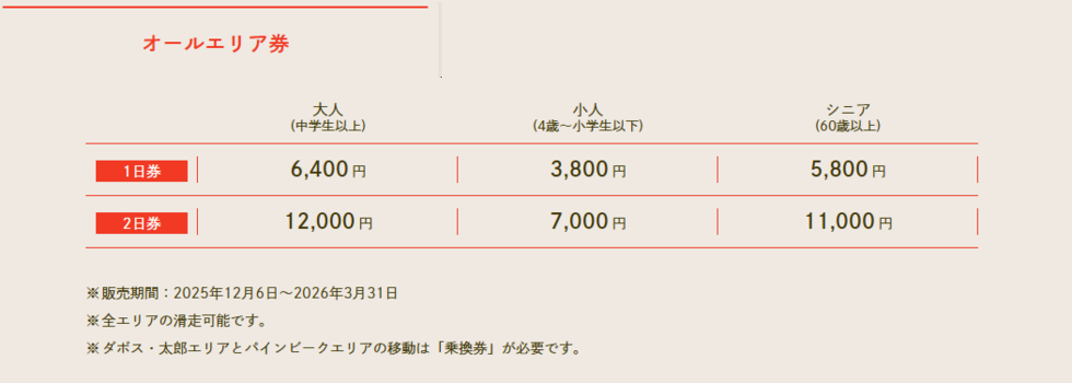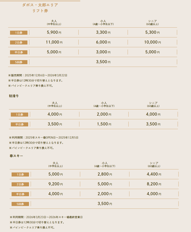 ☆ ’25~26シーズン スキー場窓口販売の料金です。その他 Web前売り もあります。詳しくは コチラへ